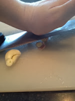 For the sweet potato casserole (all American, but I couldn't resist), I used my daddy's recipe. I cooked the sweet potatoes in the microwave first, until they were tender. Then, I peeled them to mix up the casserole; however, I was in for a surprise when I removed the peels, which I already thought were strange because they were a purpley color. The insides were white! Definitely not the bright orange I was expecting!